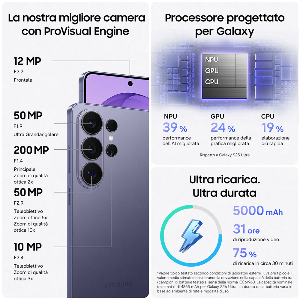 • Capacità: 4.300 mAh (S26), 4.900 mAh (S26+) e 5.000 mAh (Ultra).